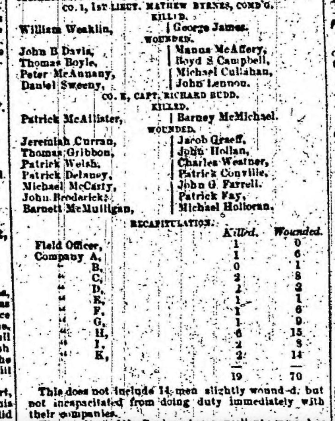 This does not include 14 men slightly wounded, but not incapacitated from doing immediately with their companies.
