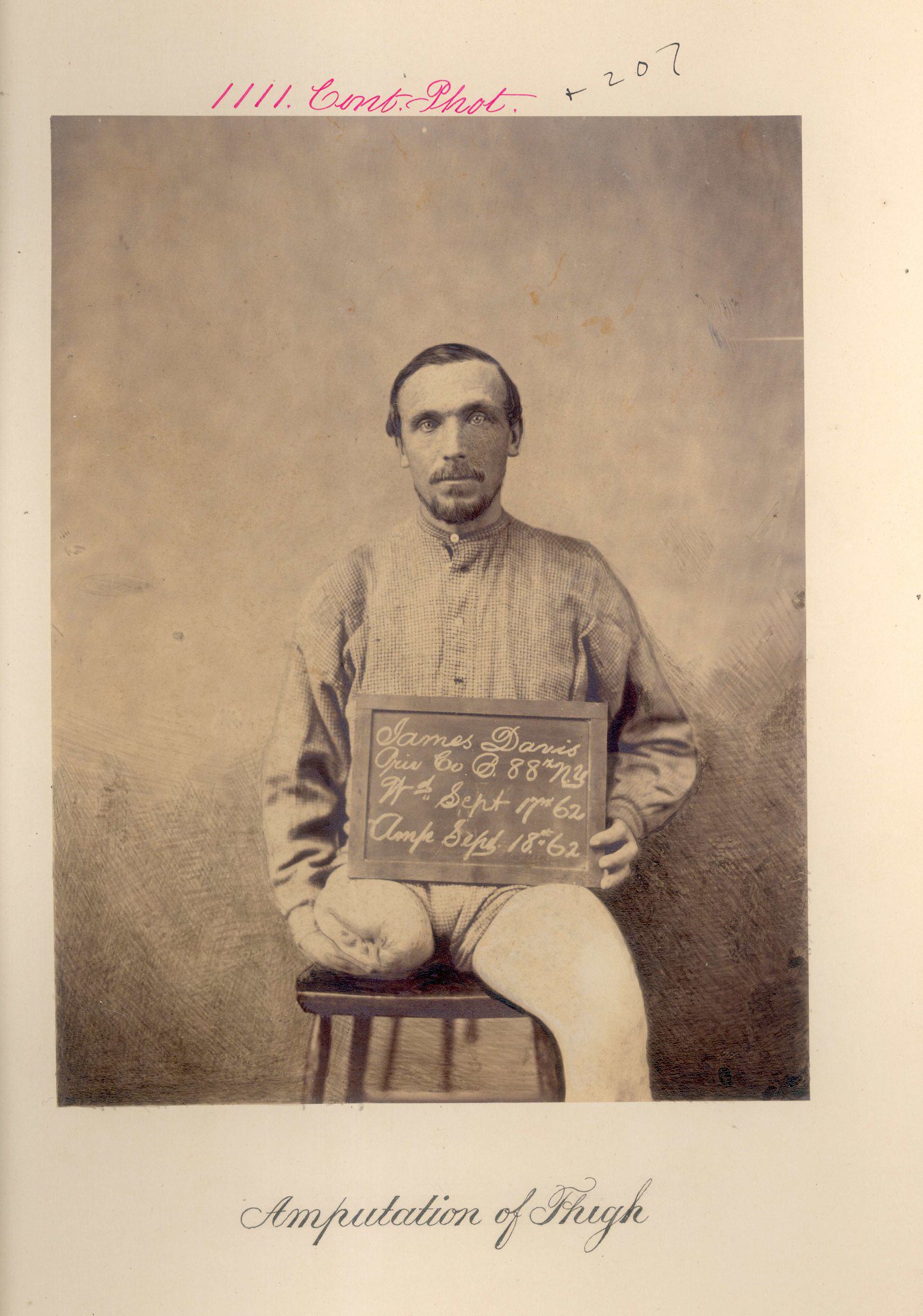 Private James Davis of the famed Irish Brigade was wounded at Antietam on 17 September 1862. His leg was amputated by his regimental surgeon the next day.