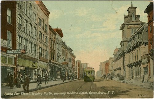 After the war he was a merchant, banker, and real estate developer – and he made a packet – but his most enduring legacy was that of hotel proprietor. This postcard shows his block-long grand hotel, “The McAdoo,” on South Elm Street in Greensboro in about 1912.