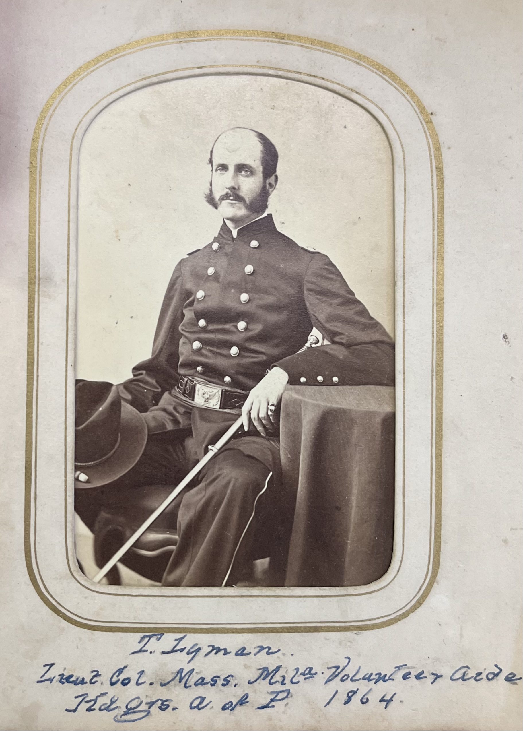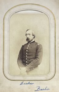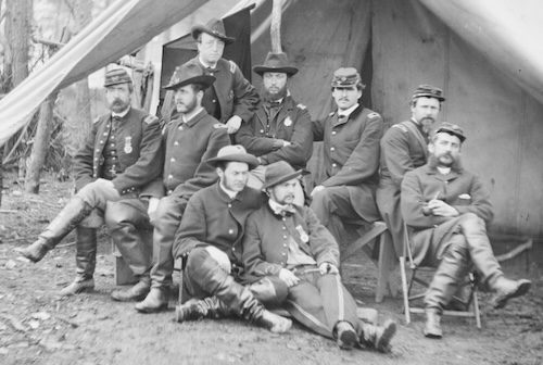 Photograph printed by Alexander Gardner from negative by Timothy O’Sullivan shows group portrait of identified soldiers posed in front of tent: Captain Francis Markoe Bache of 16th U.S. Infantry, Lieutenant Colonel Theodore Lyman III, aide-de-camp, Captain C.E. Cadwalader of 6th Pennsylvania Cavalry, Major William Riddle of 34th Pennsylvania Infantry; Major James Biddle of 16th U.S. Infantry, Captain George Meade Jr. of 6th Pennsylvania Infantry, Captain John Coalter Bates of 11th U.S. Infantry, Captain Addison Gordon Mason of 34th Pennsylvania Infantry, and Lieutenant Frederik Anton Ulrik Rosencrantz of 16th U.S. Infantry.