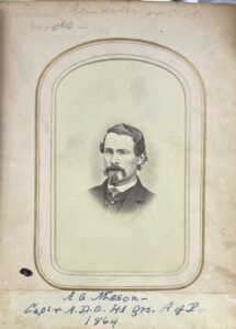Both young officers were commissioned in the staff corps of the US Volunteers in the Spring of 1863, Riddle as a Major and Mason a Captain. Riddle was sent to Major General John Reynolds’ staff, and was with that officer when he was killed at Gettysburg on 1 July 1863; he then returned to Meade’s staff.