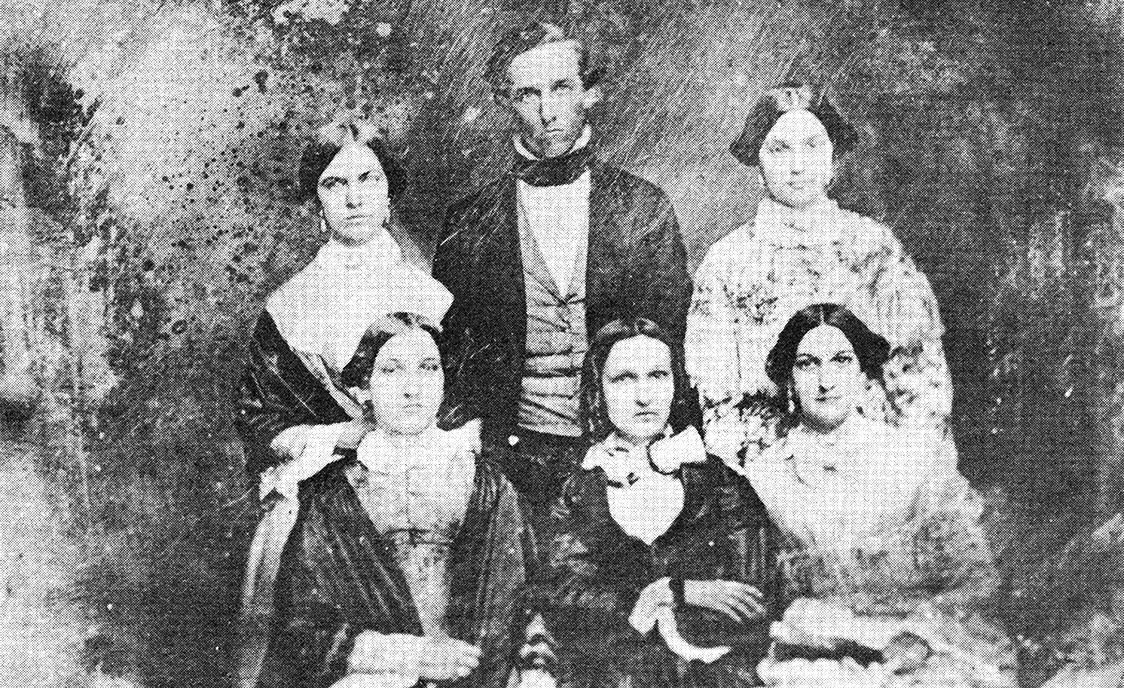 Franklin Gaillard, standing between his wife Catherine Cordes “Tattie” Porcher (1832-1856; m. 1853) and niece Catherine Marianne Gaillard (1835-1869). Front row: Franklin’s sisters, Lydia Henrietta (1831-1913), Elizabeth Octavia “Betsy” (1825-1908) and Marianne Gendron “Nan” (1833-1912).