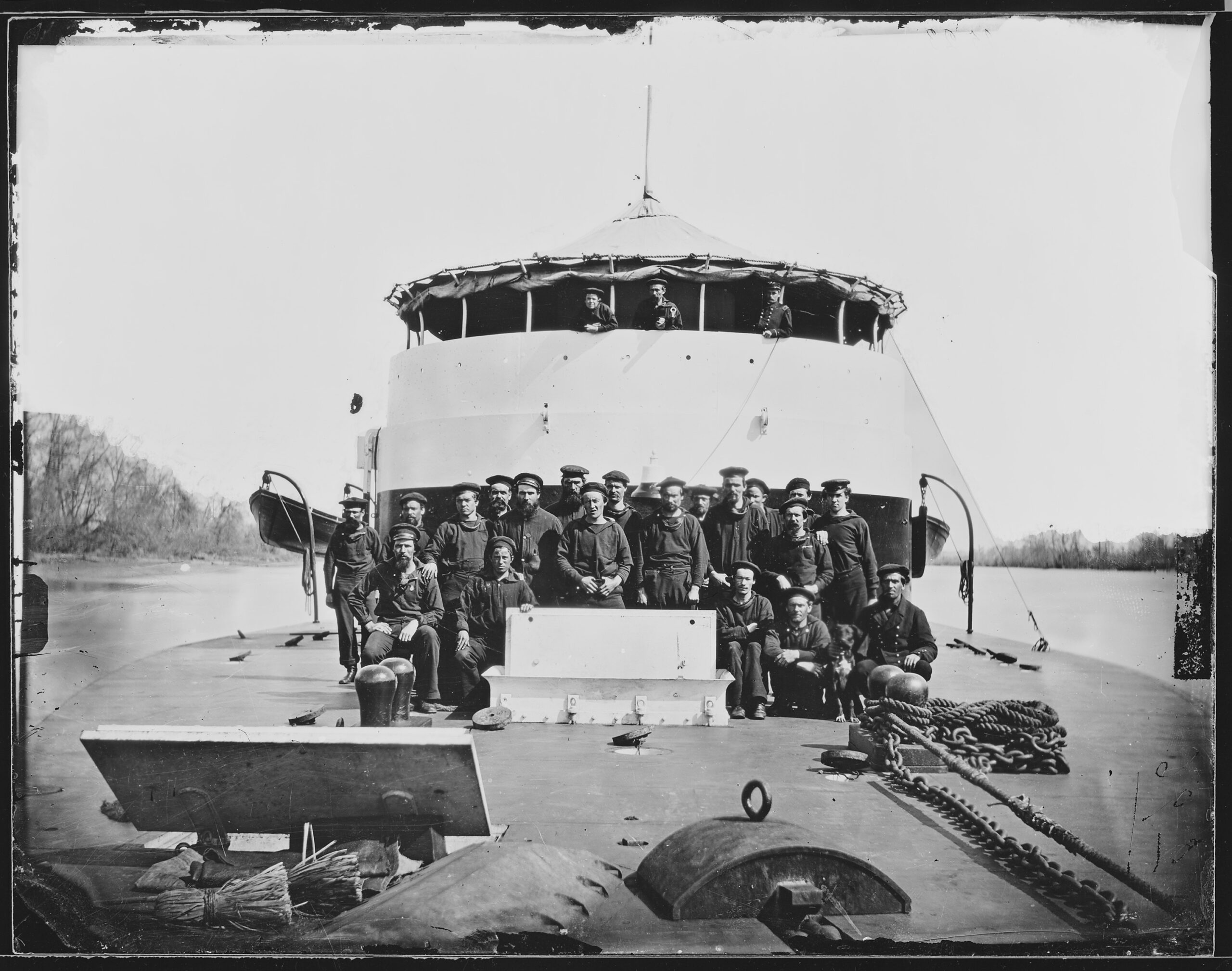 The photograph of the crew aboard USS Saugus is from the US National Archives. There’s another photograph, probably taken on the same day from the same location, of the officers of the ship – that photo is in the collection of the Naval Heritage and History Command (NHHC).