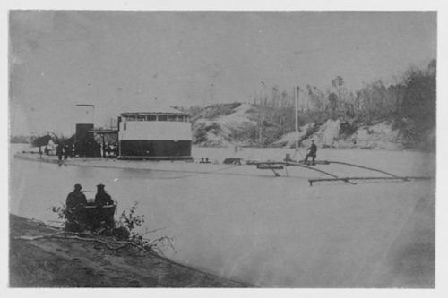Here’s another look at USS Saugus, with a minesweeping “rake” attached to her bow, on the James in early 1865.