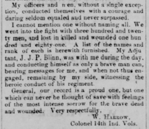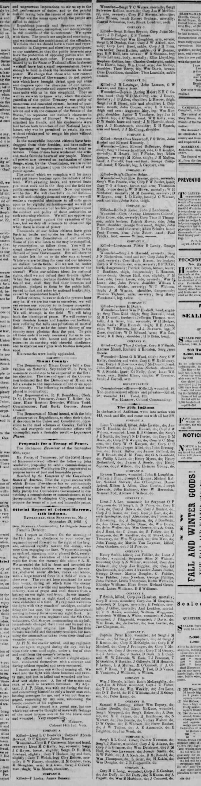 From the Indianapolis Daily State Sentinel of 27 September 1862, a copy of Colonel William Harrow’s Antietam after-action report and lists of casualties in the battle for his 14th and the 27th Indiana Infantry regiments.