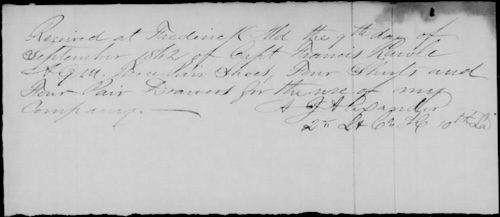 At Frederick, MD on 9 September 1862 Adam J. Alexander of the 10th Louisiana Infantry signed this receipt for 3 pairs of shoes, 4 shirts, and 4 pairs of drawers for his men. It is likely these had been procured in the city from local businesses by Confederate quartermasters.