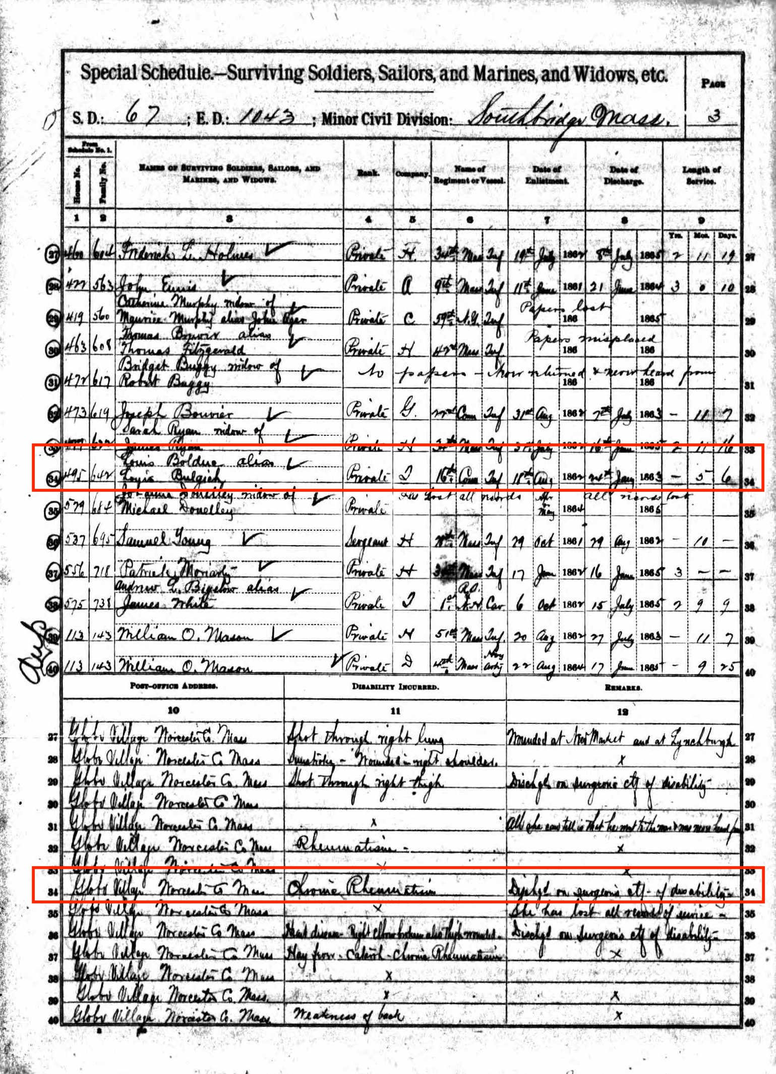 I do not know why he used the Bulgick name instead of the one he was born with – but I believe he consciously chose it, it’s not just a phonetic mis-transcription: in addition to enlisting as Bulgick, he also gave that name to the 1860 and 1870 census enumerators and the Massachusetts towns where some of his 8 or more babies were born. Some of his children seem to have later used Bulgick (or variations) and some Bolduc.