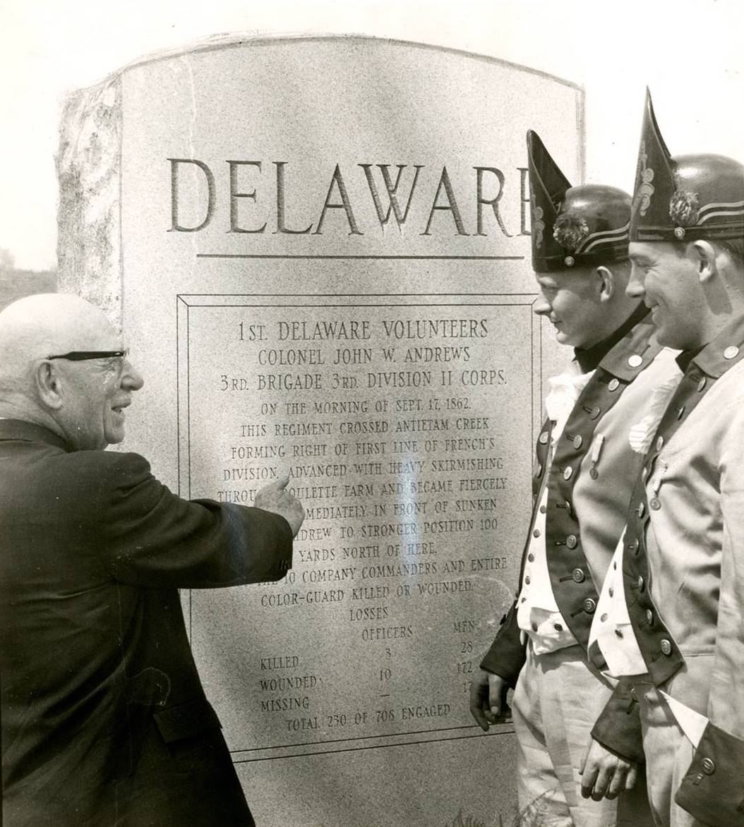 It’s one of 3 placed by the state Centennial Commission in 1962 and 1964. The other two, to the First and Second Regiments, are in or near the Bloody Lane. Here’s a particularly interesting picture taken at the 1962 dedication of the one to the First Delaware.